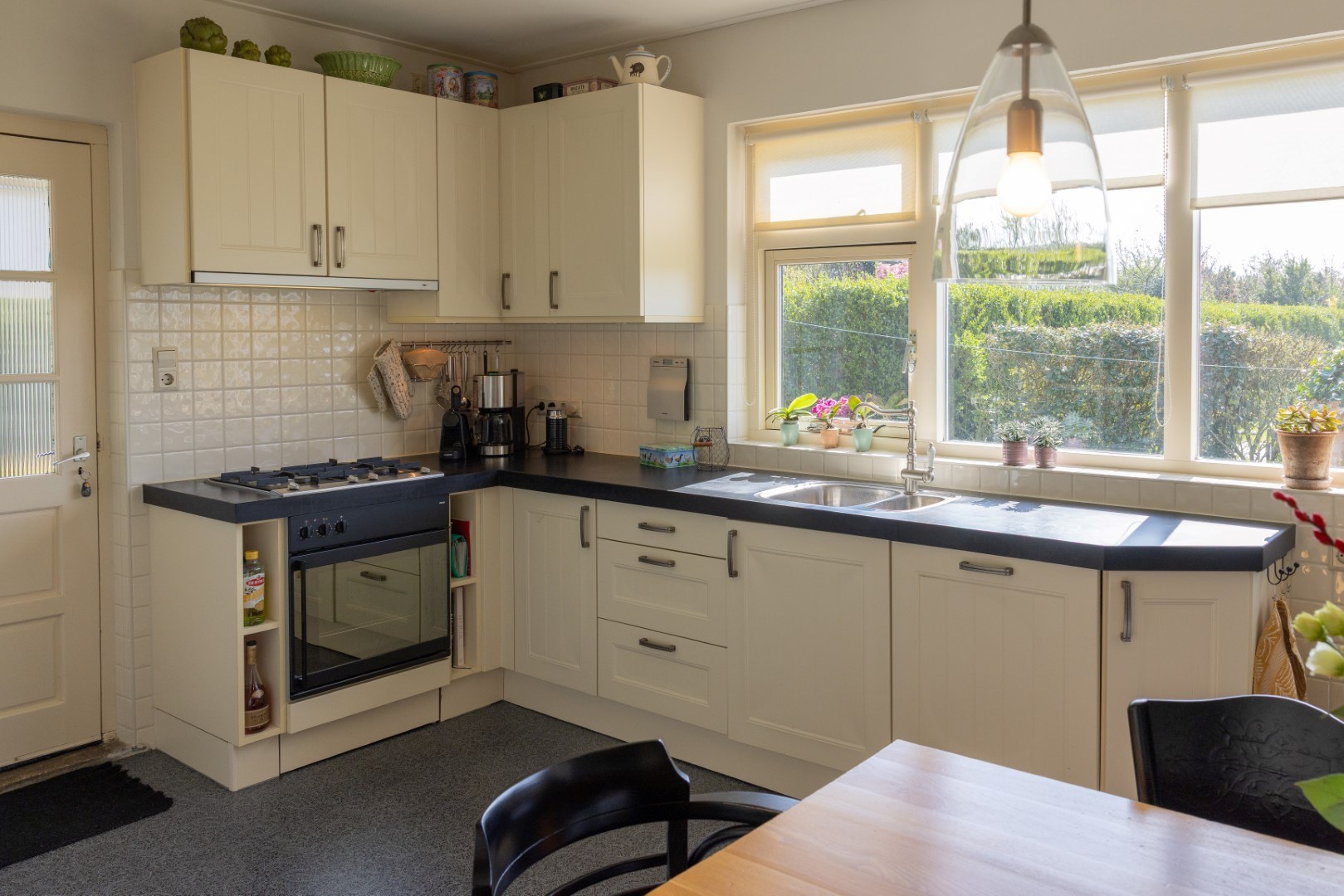 De keuken bevindt zich aan de voorzijde en is voorzien van (inbouw)apparatuur: oven, gaskookplaat, afzuigkap, en vaatwasser. Aansluitend een portaal met toilet en een bijkeuken met deur naar de schuur. In de aanbouw (hossie) de entree. Via de binnenhal met trapopgang en meterkast is de woonkamer te bereiken. Deze is voorzien van houten vloer en biedt eveneens een weids uitzicht.