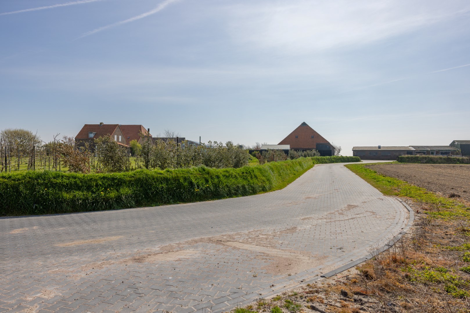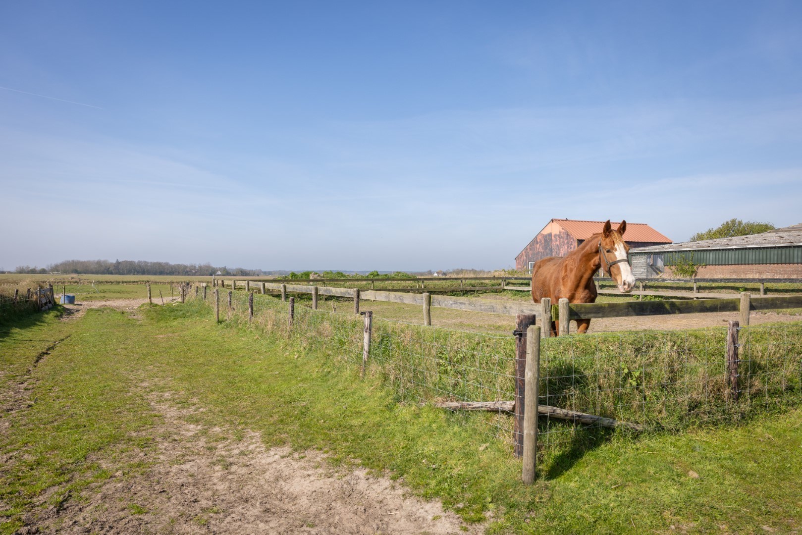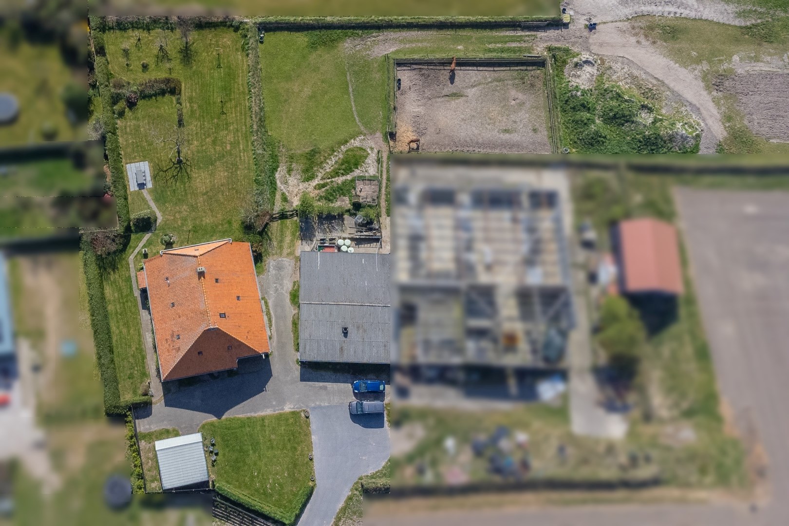 Entree over de eigen toegangsweg naar het erf met voldoende ruimte om met meerdere auto’s te parkeren. Er is een garage/kapschuur, en een half-vrijstaande schuur waarin zich nog een bunker en 2 paardenboxen bevinden.